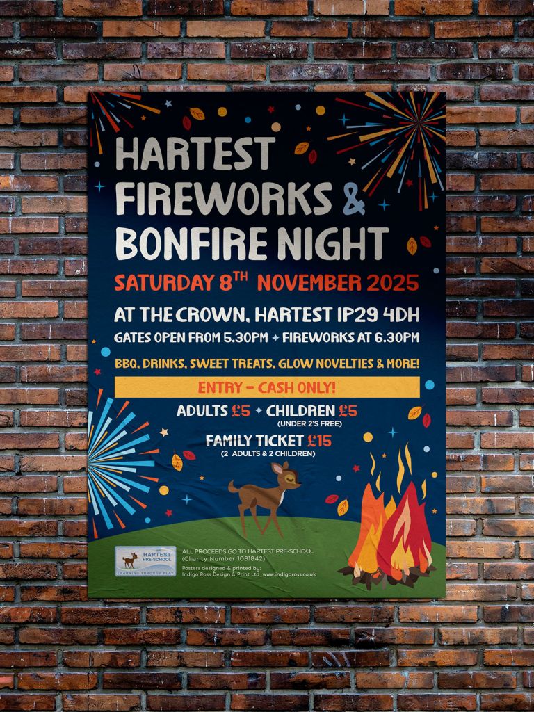 We started November with a bang! As part of our ’30 Things for 30 Years’, we created the designs and print for Hartest Pre-School’s Fireworks Night. It was a joy to provide some feel-good print for such a brilliant community celebration that really lit up the night.