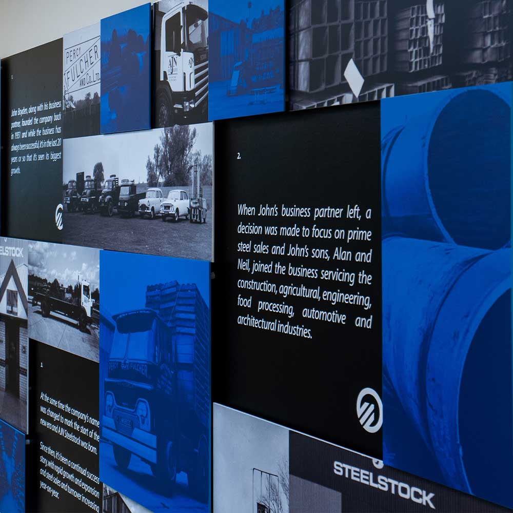 Our collaboration with AJN Steelstock involved a meticulous selection process to identify the most fitting imagery and information for the creation of visuals that would adorn their workspace.